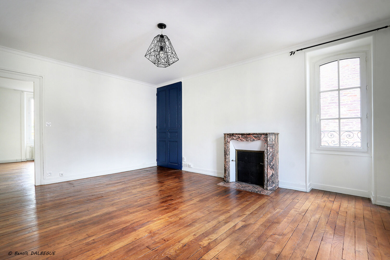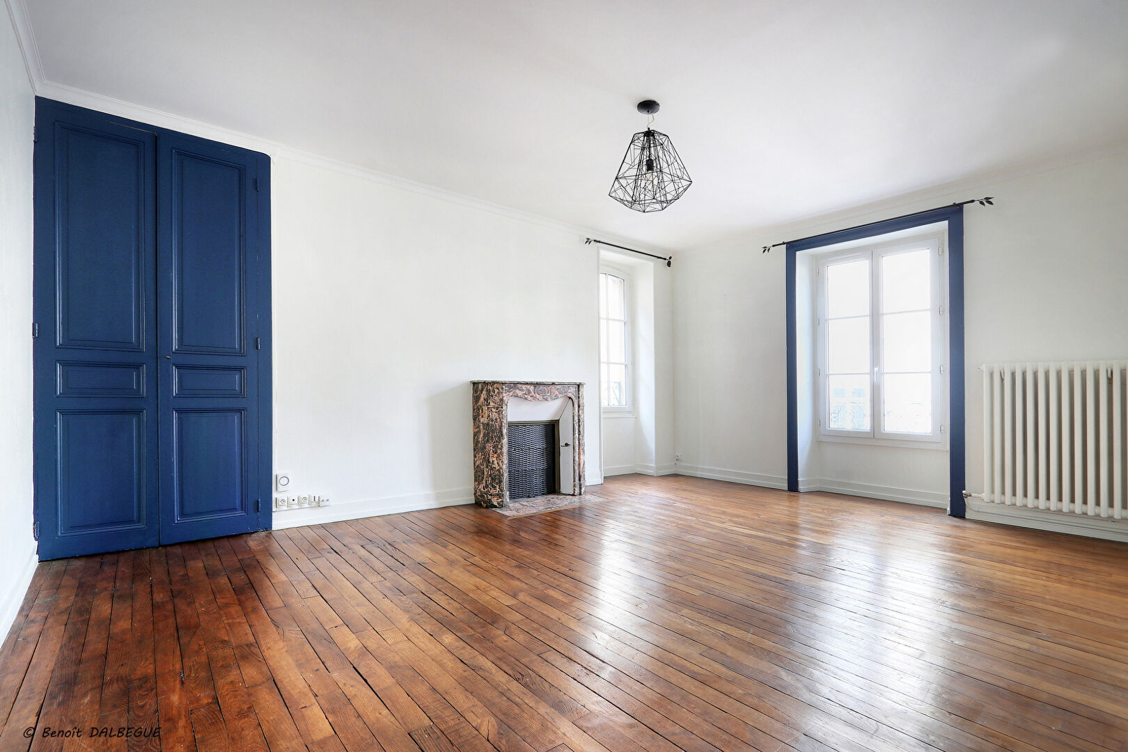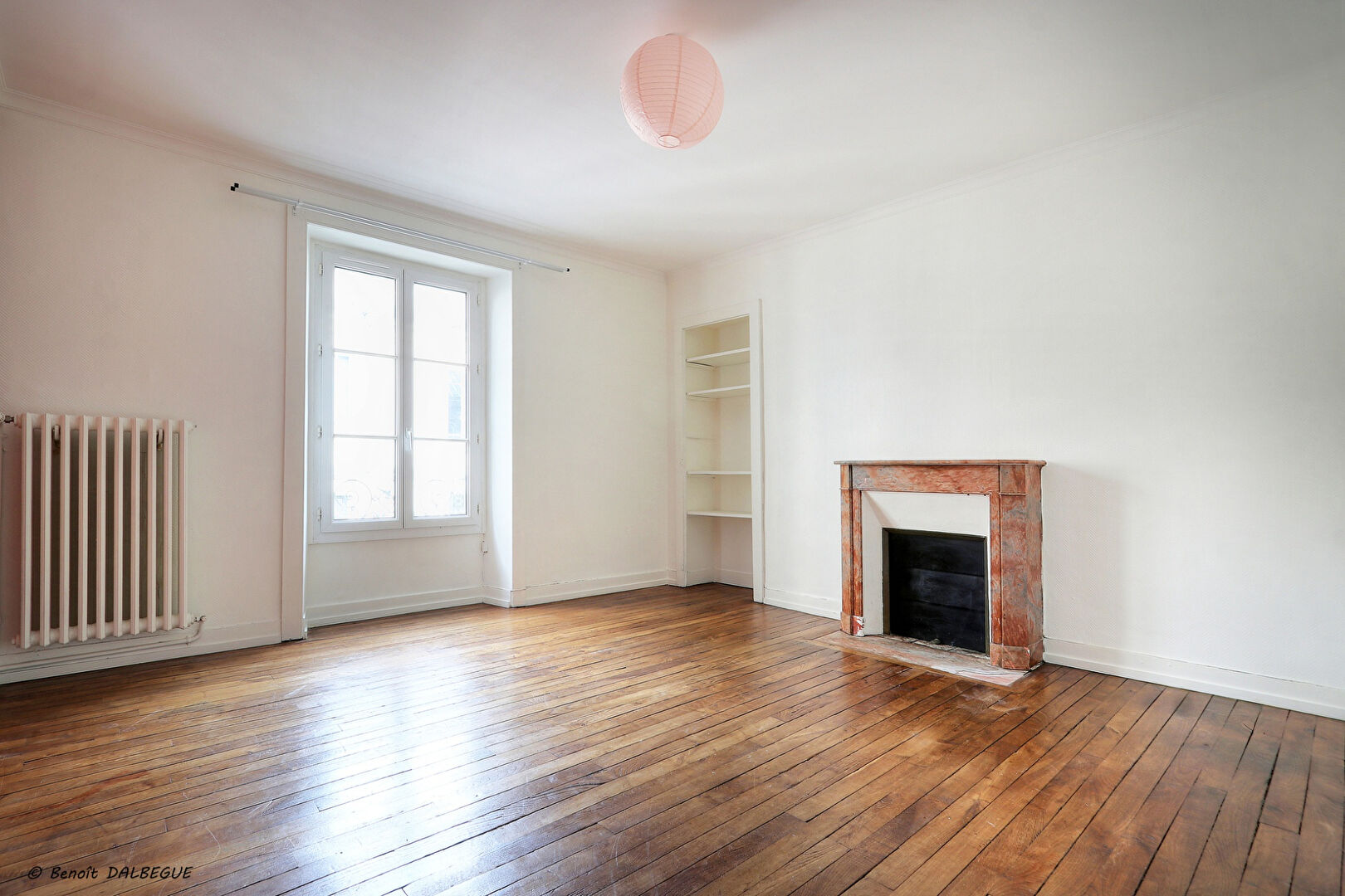 un séjour lumineux avec cheminée décorative et double exposition,