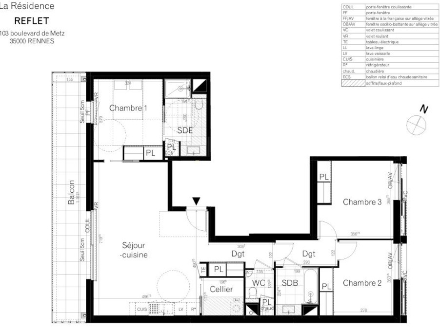 Vous y trouverez cet appartement 4 pièces de 93 m2 comprenant : 3 chambres avec placard, un cellier, 1 salle d'eau, 1 salle de bain, 1 WC individuel et un spacieux séjour/cuisine de 33m² donnant sur un balcon de 18 m2 exposé Sud-Ouest.