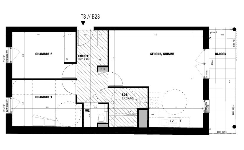 Vous y trouverez cet appartement 3 pièces de 63 m² au 2ème étage comprenant : un séjour-cuisine de 26 m² donnant sur un balcon d'environ 10 m², 2 chambres dont une avec placard, une salle de bain, WC séparé.