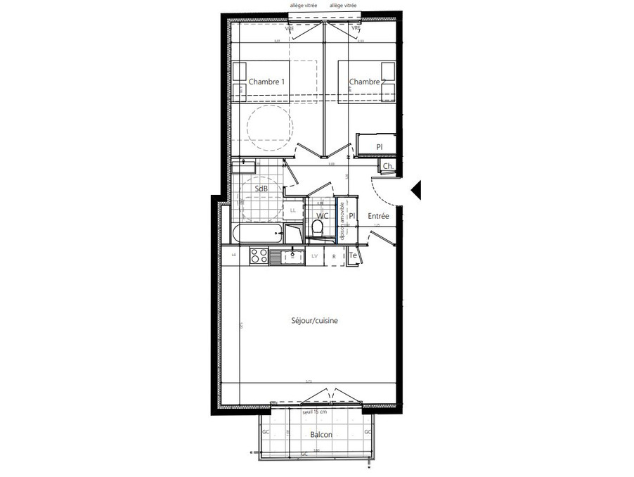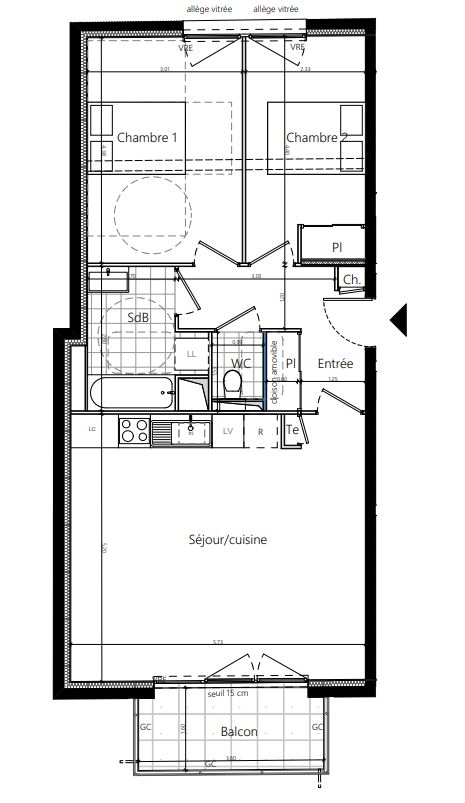 Vous y trouverez cet appartement T3 de 66 m² au 2eme étage comprenant : une entrée, un séjour/cuisine de près de 30 m² donnant sur un balcon exposé plein sud, 2 chambres et une salle d'eau avec WC séparé.