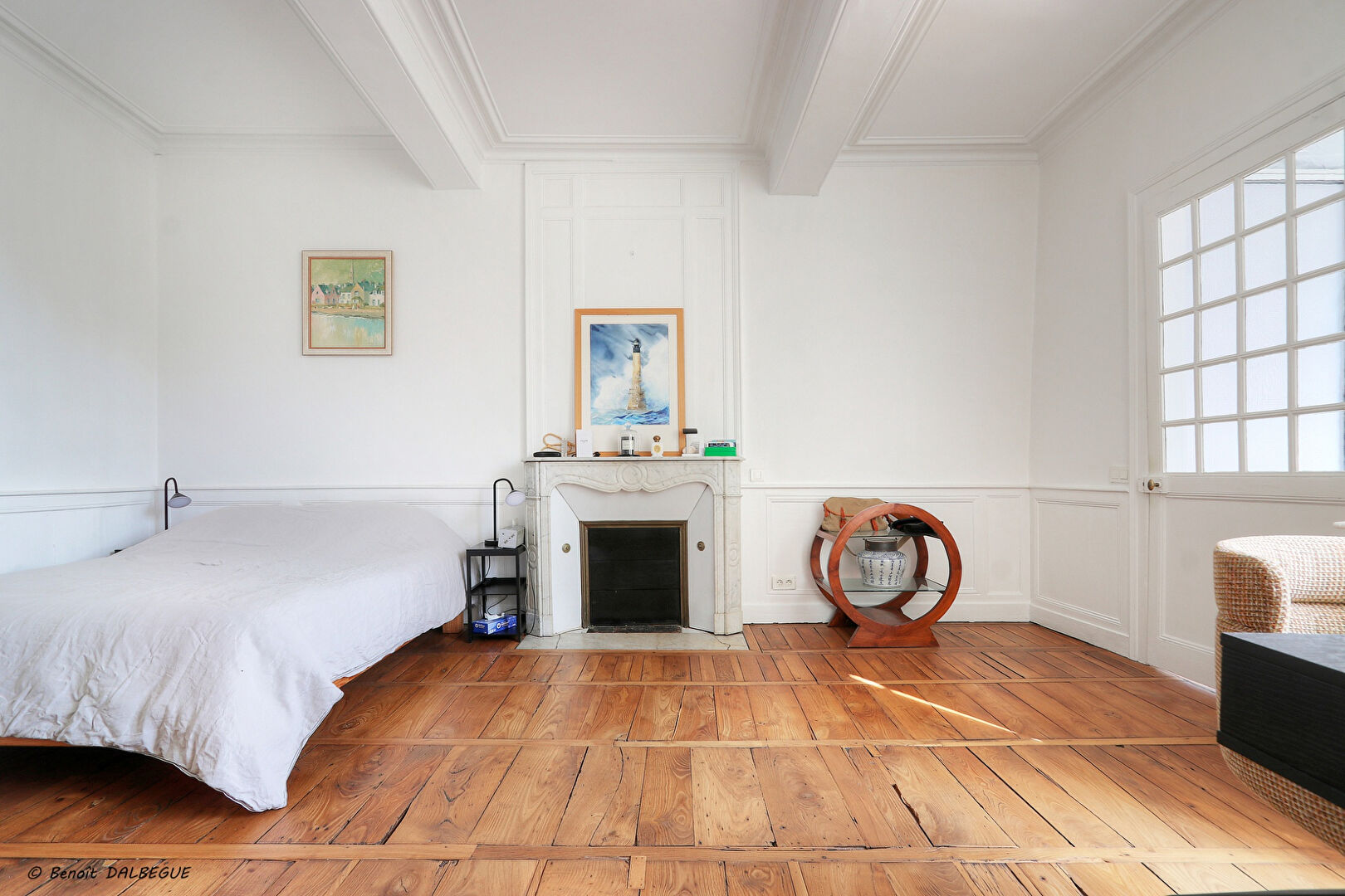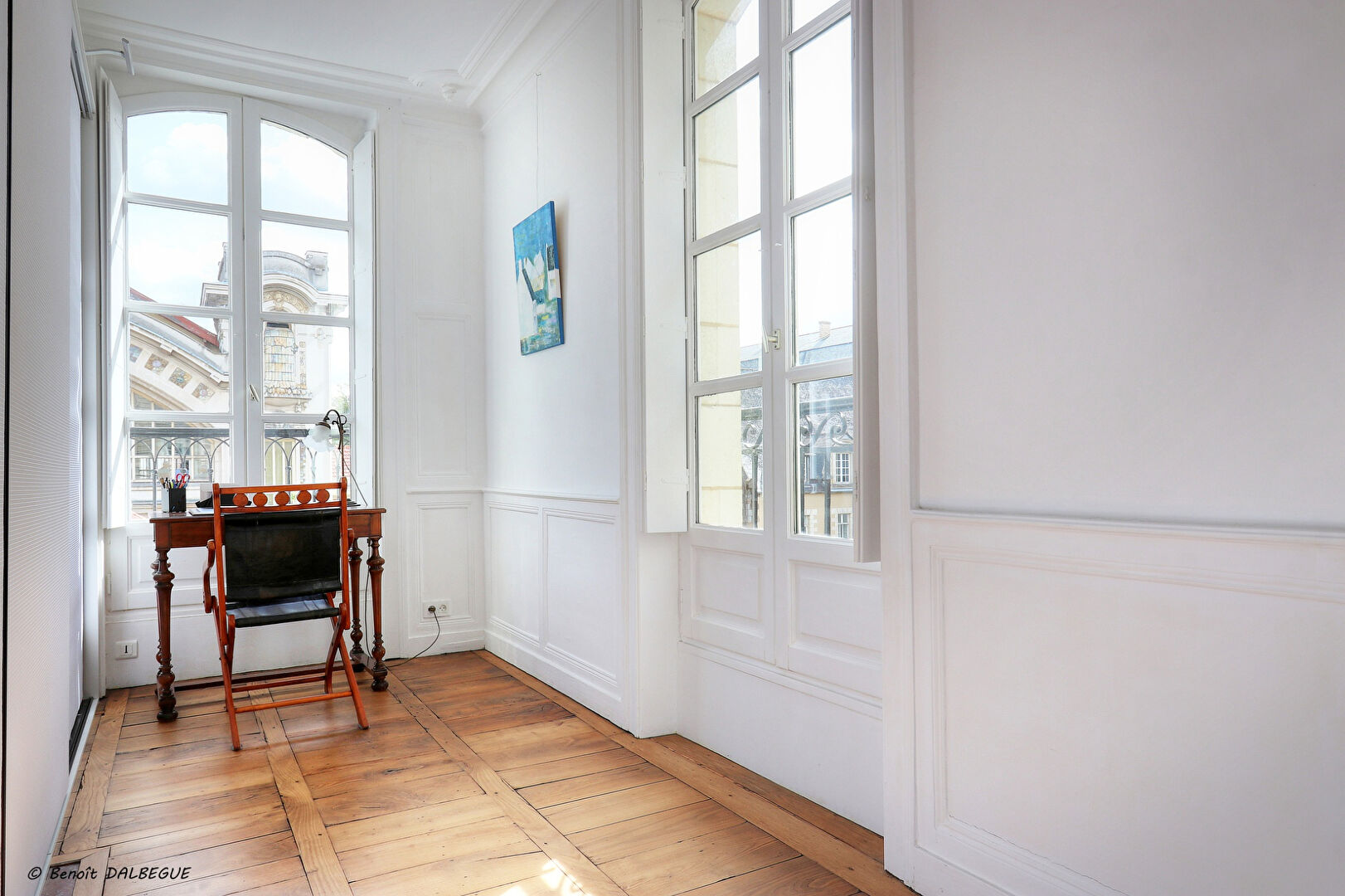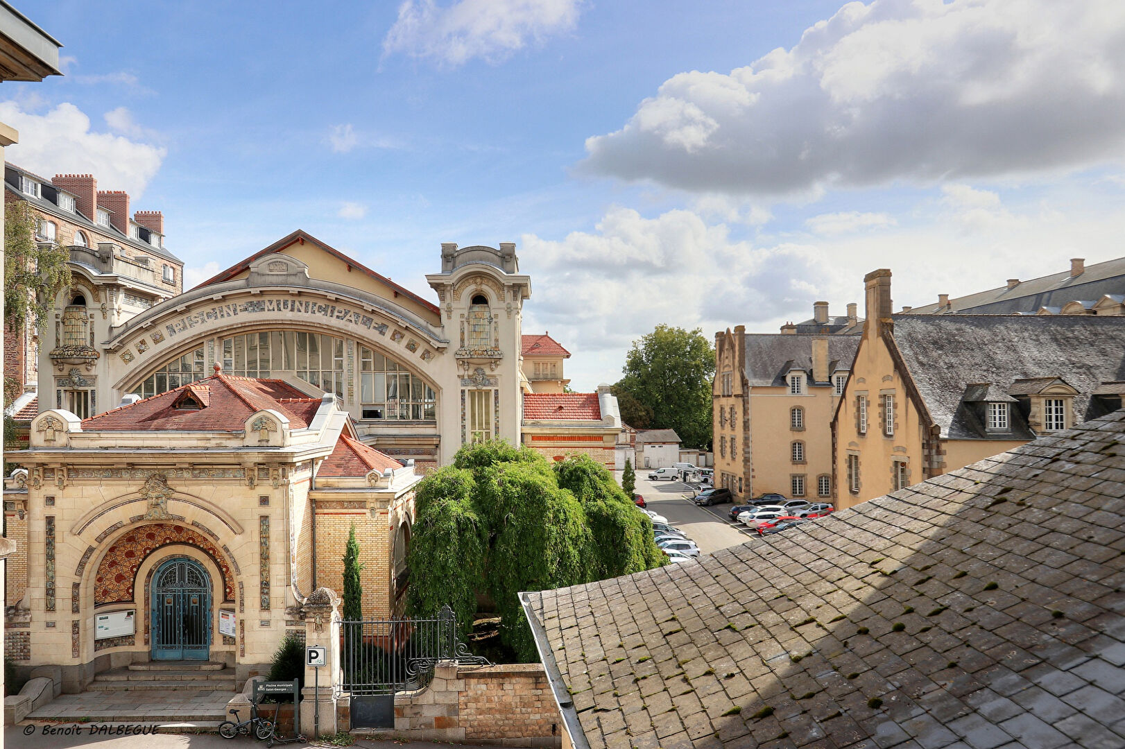 Rennes, centre historique, magnifique appartement rénové comprenant une entrée avec rangement, un grand séjour de plus de 35m2 sur parquet avec cheminée et moulure, une cuisine aménagée et équipée sur parquet avec grand rangement et cellier, une chambre spacieuse sur parquet de 18 m2 avec belle cheminée, une seconde chambre en enfilade pouvant servir de dressing ou de bureau, une pièce servant de couchage, une salle d'eau avec WC.
