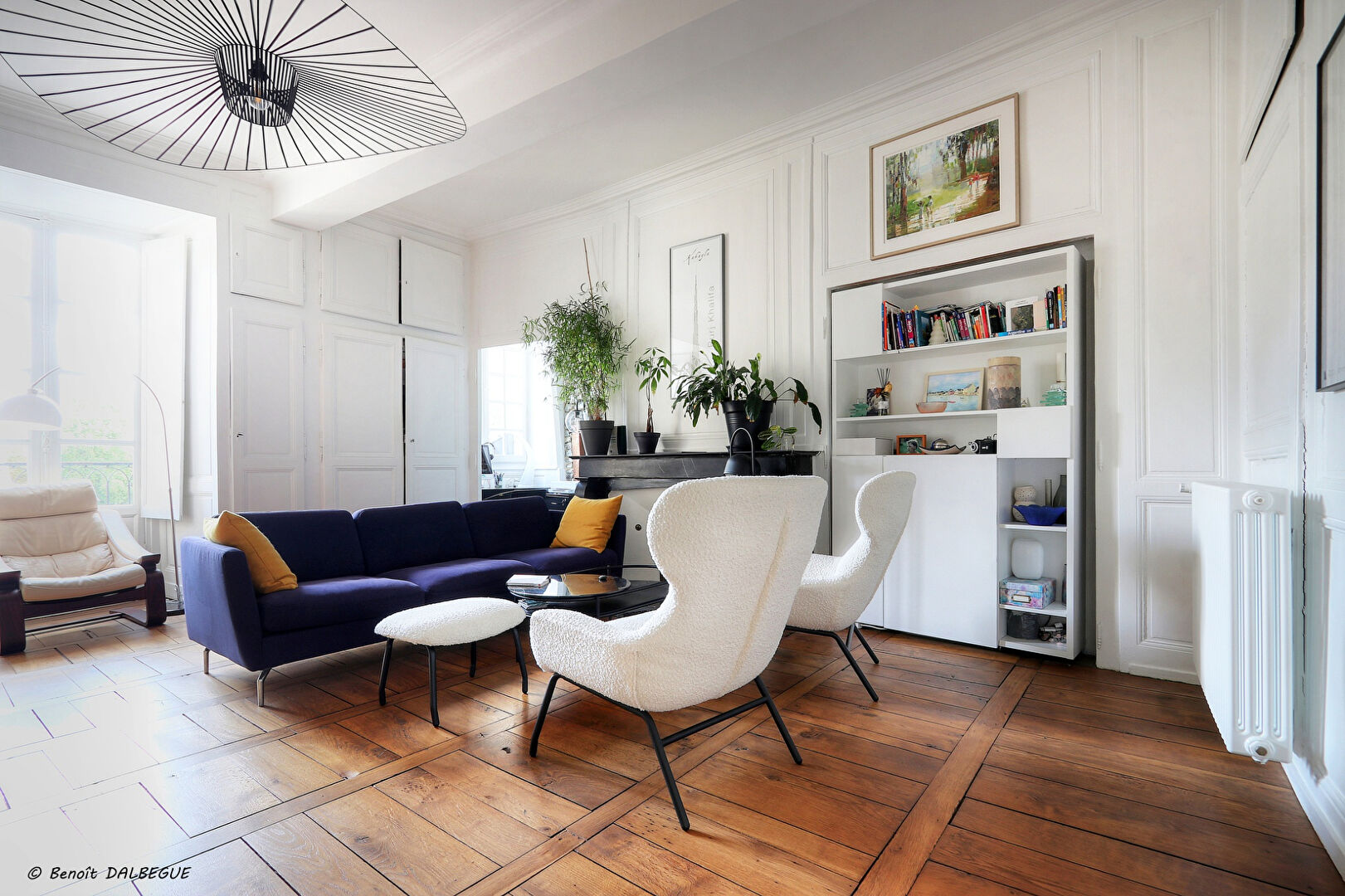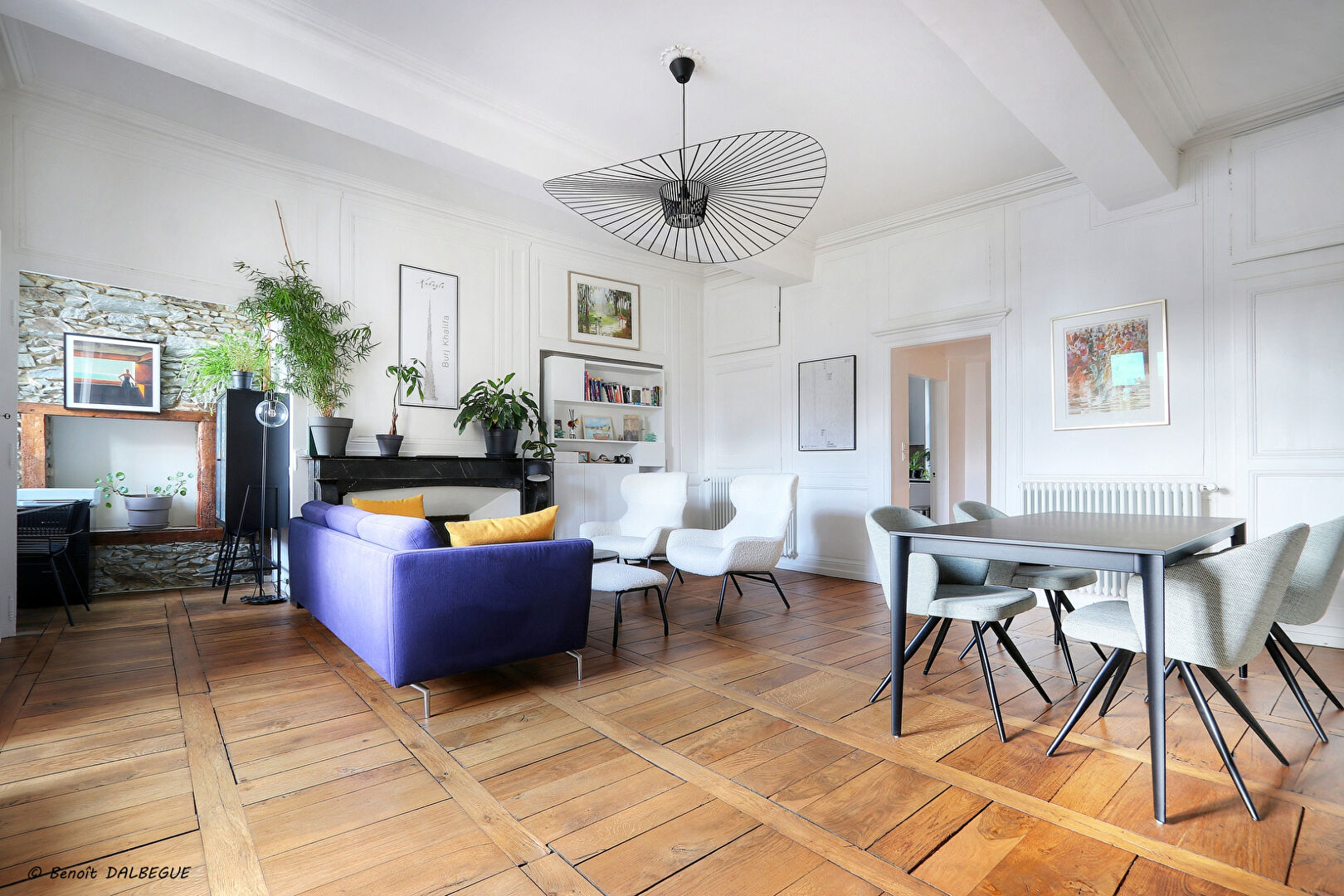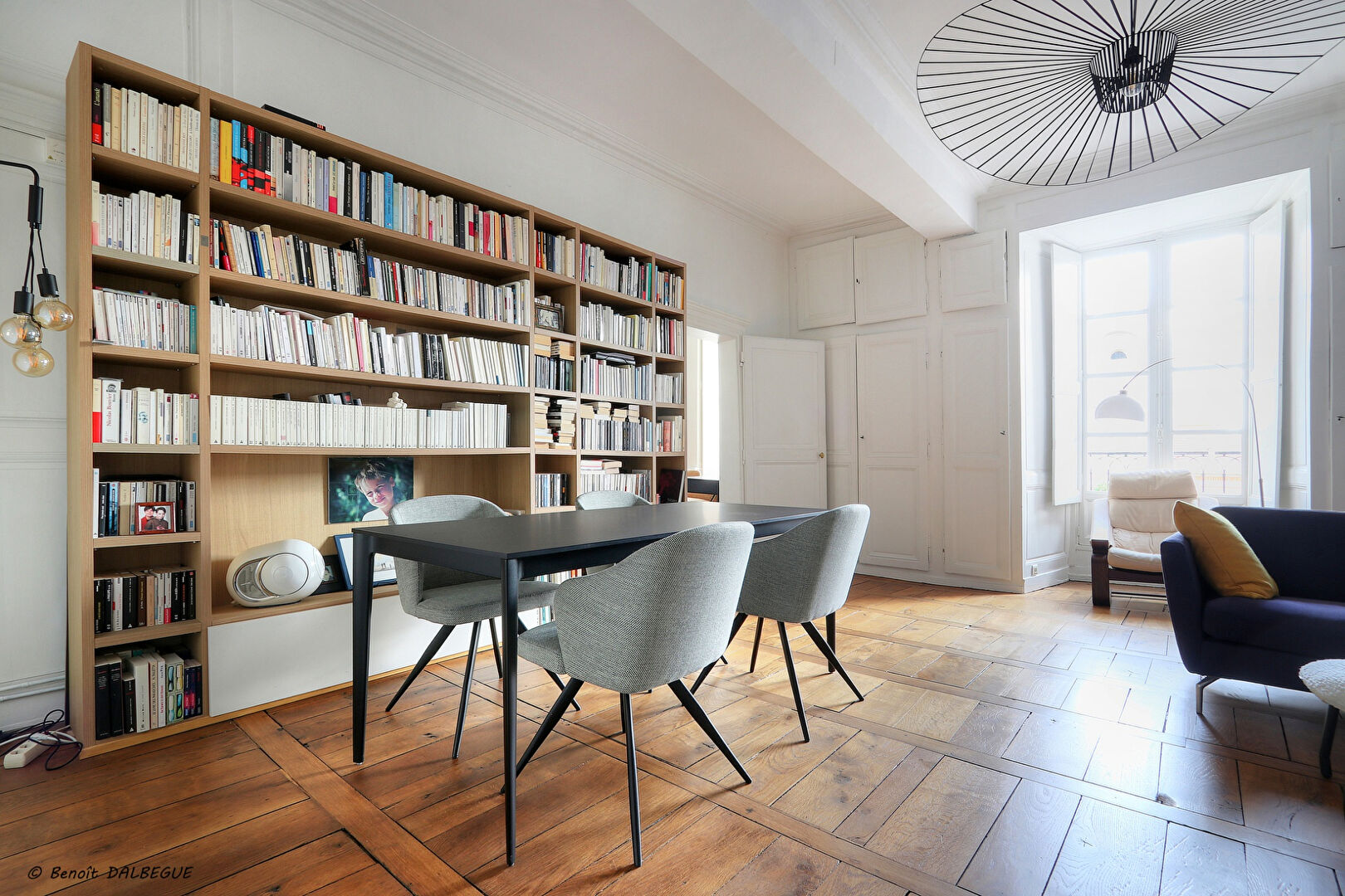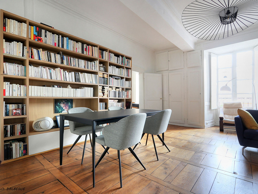 Rennes, centre historique, magnifique appartement rénové comprenant une entrée avec rangement, un grand séjour de plus de 35m2 sur parquet avec cheminée et moulure, une cuisine aménagée et équipée sur parquet avec grand rangement et cellier, une chambre spacieuse sur parquet de 18 m2 avec belle cheminée, une seconde chambre en enfilade pouvant servir de dressing ou de bureau, une pièce servant de couchage, une salle d'eau avec WC.