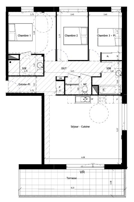 Vous y trouverez cet appartement T4 au 2ème étage comprenant : une entrée avec placard, 3 chambres dont une suite parentale avec sa salle d'eau, une salle de bain, un WC séparé et un séjour/cuisine de 32 m2 donnant sur une spacieuse terrasse 16m2 exposée plein Sud.