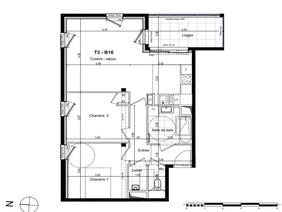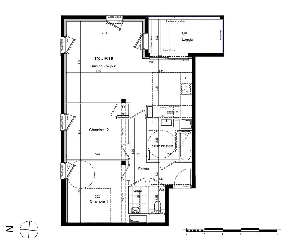 Vous y trouverez cet appartement 3 pièces au 1er étage comprenant : 2 chambres, une salle de bain avec WC séparé et un séjour cuisine de 28 m2 donnant sur une loggia de