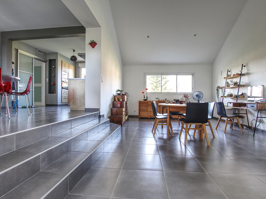 La maison se compose d'une entrée qui distribue un premier salon avec cheminée, une cuisine aménagée et équipée dinatoire donnant sur un vaste séjour cathédrale avec poêle à granulés et en contre bas un deuxième salon. Vous disposerez également au RDC d'une chambre et d'une salle de bains.