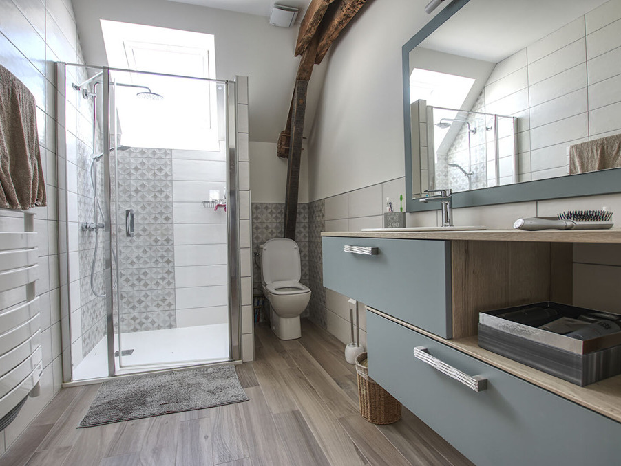 A l'étage, d'un coté, une suite parentale avec sa chambre de 25m2, son dressing aménagée et sa salle d'eau avec WC. De l'autre coté une mezzanine pouvant accueillir un bureau et un canapé lit, 3 chambres, une salle de bains et un WC.