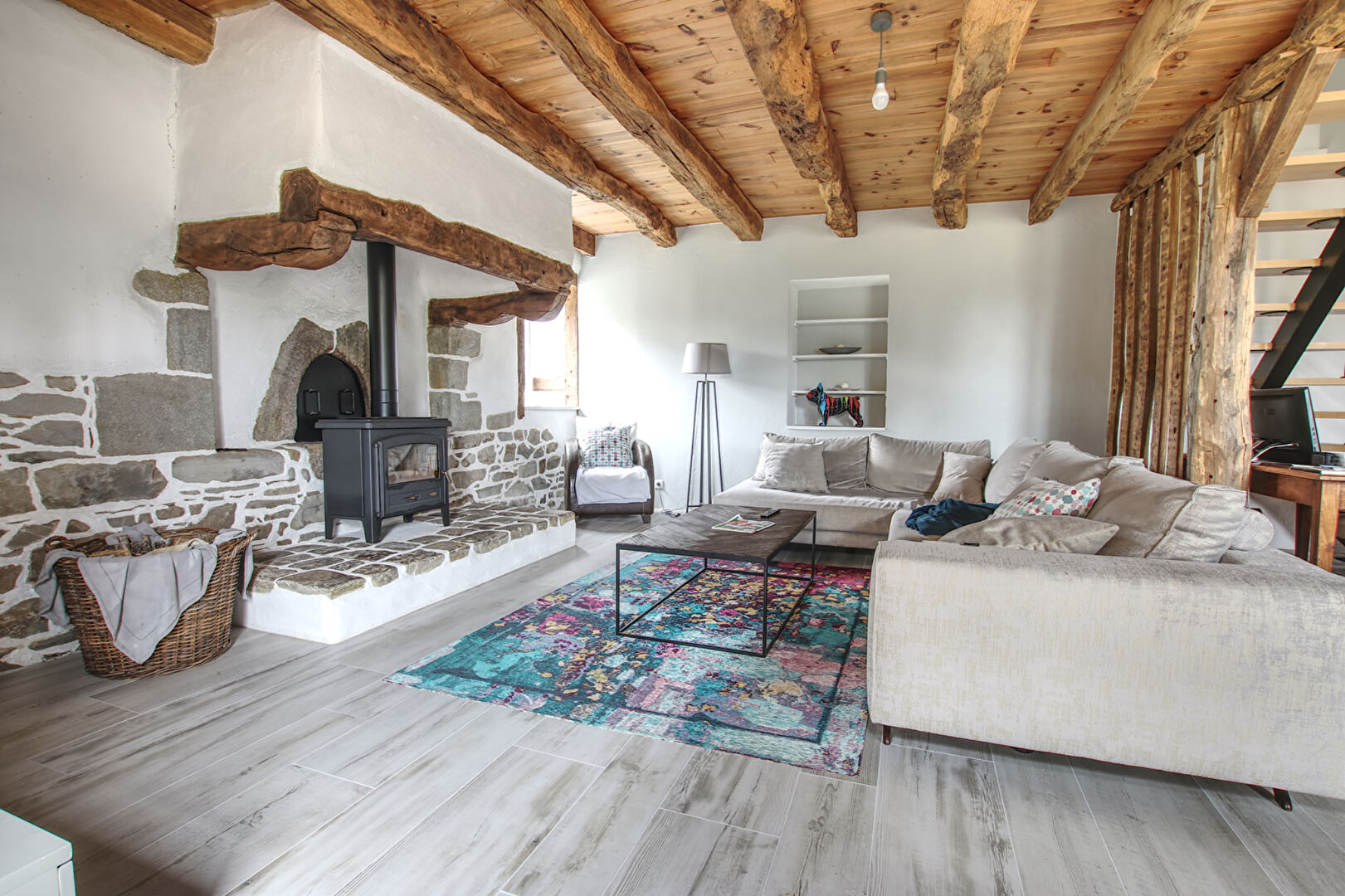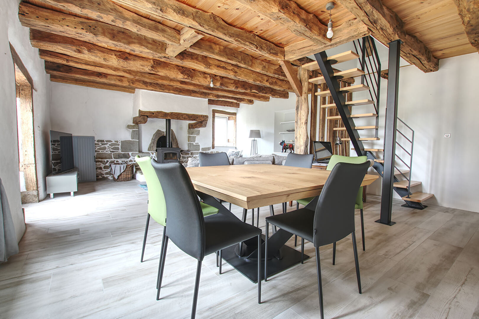 Elle se compose au RDC d'une entrée avec placard, une cuisine dinatoire aménagée et équipée de plus de 35m2 avec cheminée, prolongée d'un salon de 43m2 avec poêle à bois. Vous disposerez également d'une chambre avec une salle d'eau. Une grande buanderie aménagée et un cellier complètent le RDC.