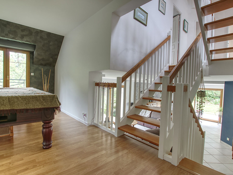 Au 1er demi-niveau, vous trouverez une mezzanine pouvant accueillir un billard, un bureau, et une suite parentale comprenant une chambre, un dressing, et une salle d'eau.
