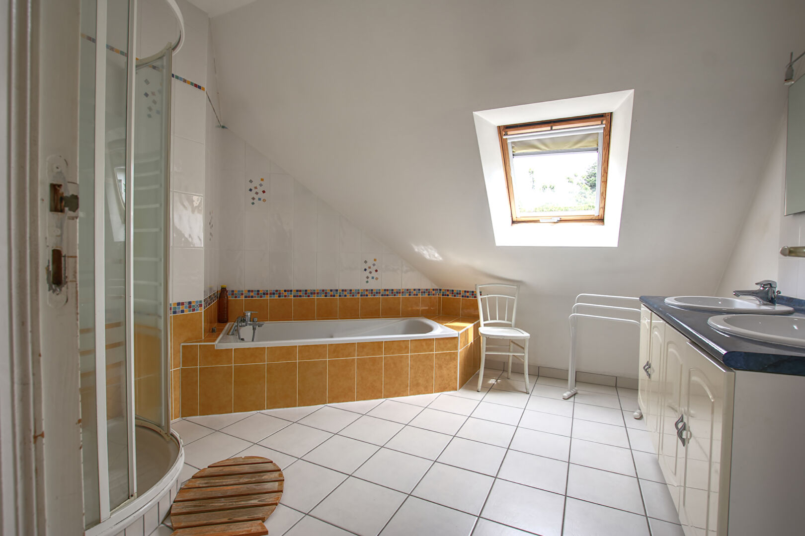 Au demi-niveau suivant une mezzanine dessert 2 chambres, une salle de bains + douche et un wc.